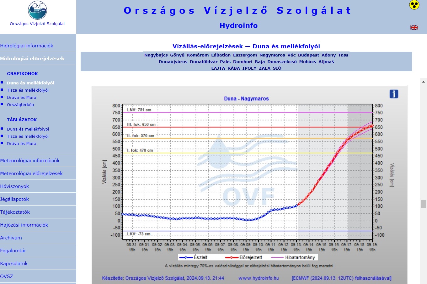 A Országos Vízjelző Szolgálat ma reggeli előrejelzése szerint szeptember 17-én este fogja átlépni a Duna a múlt karácsonyi 550 cm-es szintet Nagymarosnál, és 19-én este 670 cm-t várnak. A Duna jelenleg Nagymarosnál 150 cm-en áll.