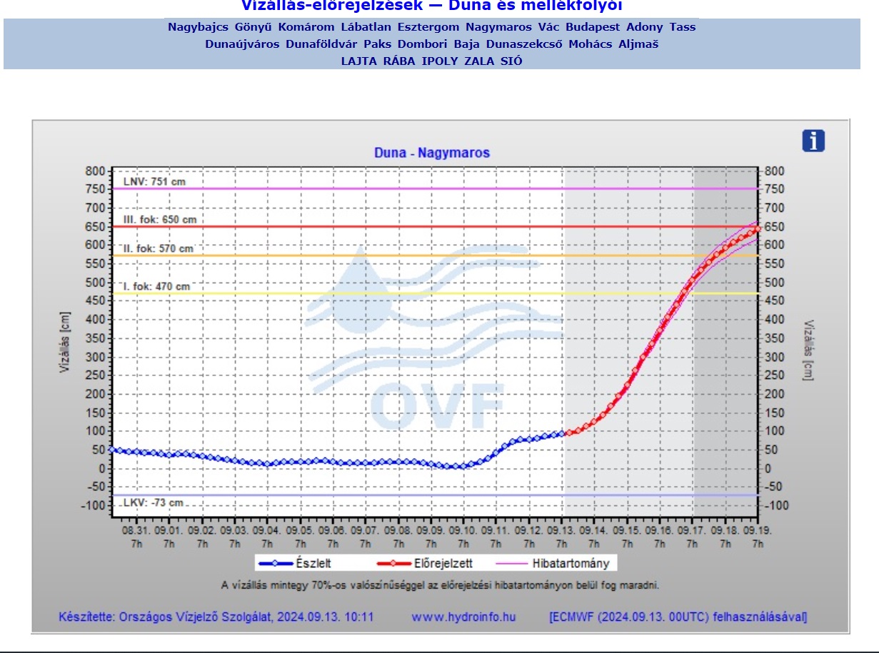 OVF Országos Vízjelző Szolgálat ma reggeli előrejelzése szerint szeptember 18-án reggel fogja átlépni a Duna a múlt karácsonyi 550 cm-es szintet, és 19-én reggel 650 cm-t várnak.